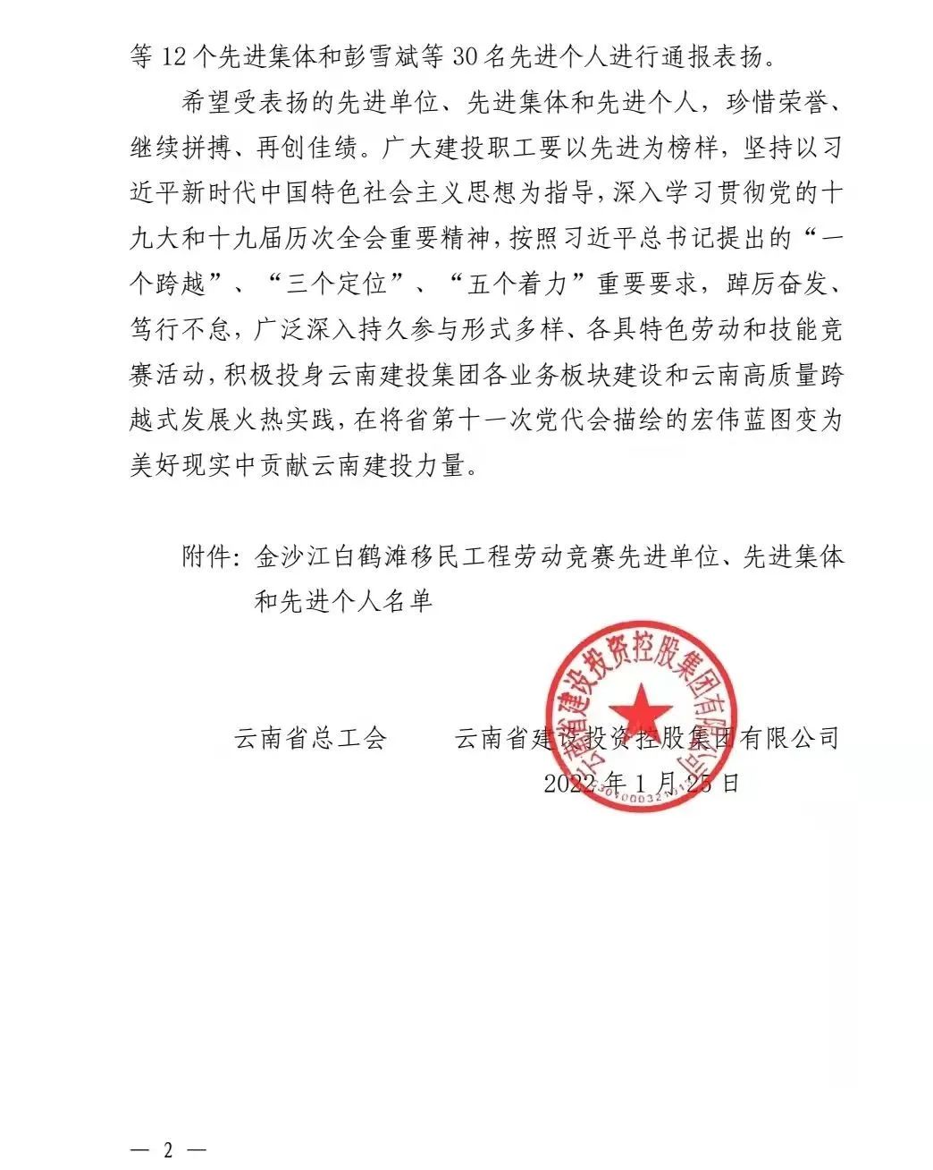 近日,云南省總工會和云南省建設投資控股集團有限公司聯合發文,通報表揚金沙江白鶴灘移民工程勞動競賽先進單位、先進集體及先進個人。公司第八直管項目部榮獲先進集體,公司總經理助理、第十一直管項目部經理施正東,第五直管項目部副經理張勇以及第三直管項目部項目經理何明亮榮獲先進個人。