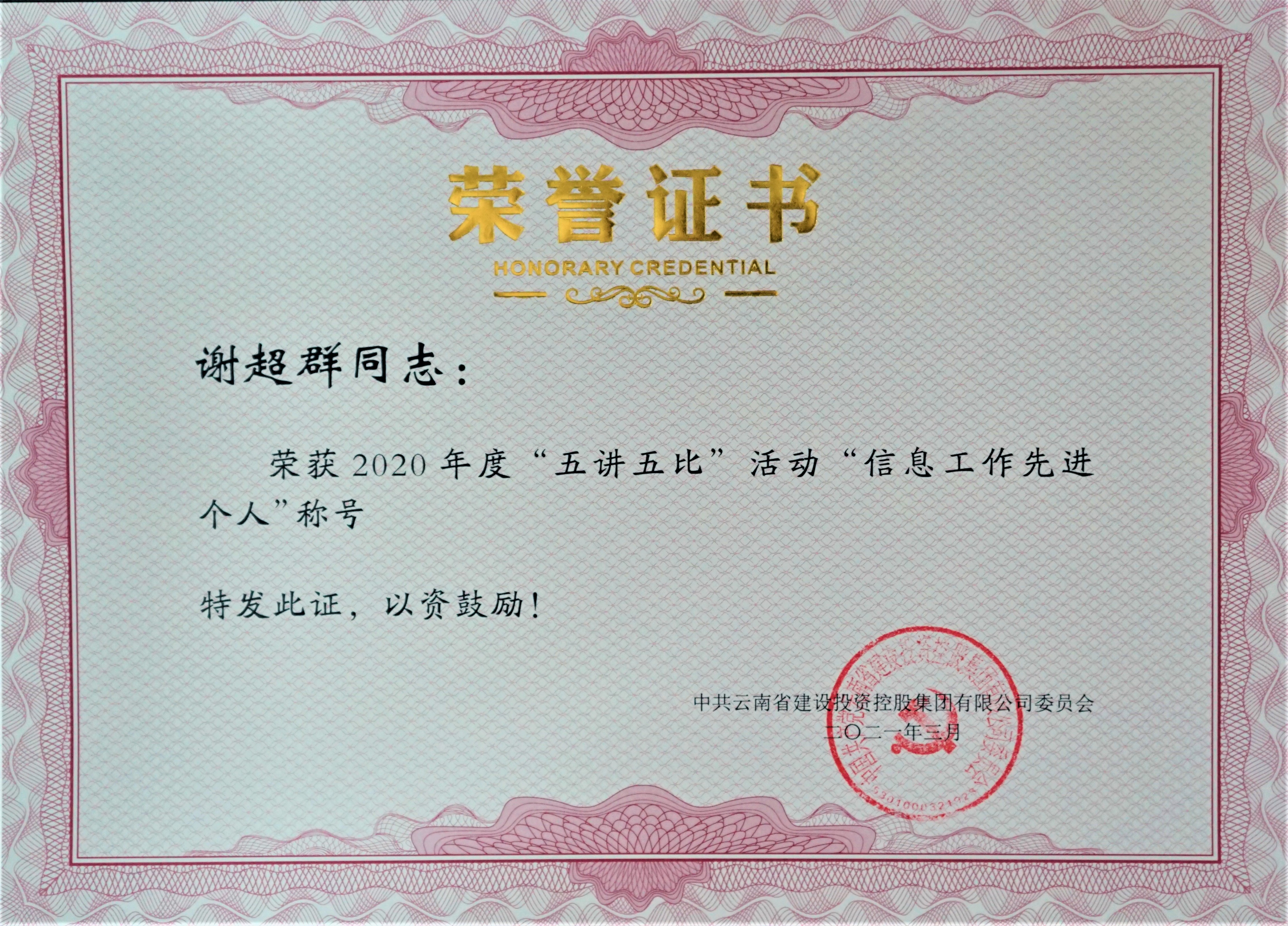 其中,公司榮獲“信息工作先進集體”稱號;金沙江白鶴灘水電站巧家縣移民房屋與市政工程總承包(EPC)項目、昆明醫科大學第一附屬醫院5號樓建設項目榮獲“最佳示范項目”稱號;公司法律事務部經理王娟榮獲“法務工作先進個人”;黨委工作部業務主管謝超群榮獲“信息工作先進個人”。