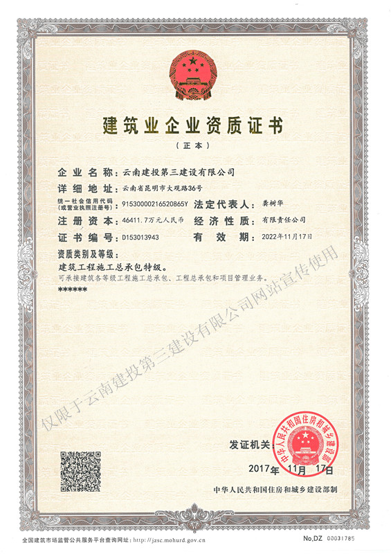 ?????云南建投第三建設有限公司具有建筑工程施工總承包特級資質、設計建筑行業甲級資質、機電設備安裝專業承包一級資質、消防設施工程專業承包一級資質、建筑裝修裝飾工程專業承包一級資質、市政公用工程施工總承包二級資質、鋼結構工程專業承包二級資質、公路工程施工總承包三級資質、人防防護通風工程安裝(資質),已通過質量管理(GB...